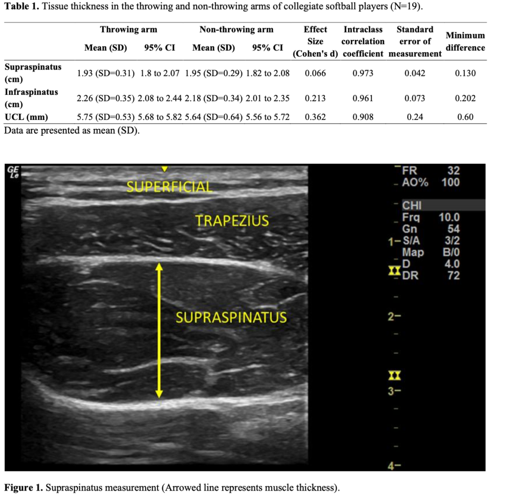 In a brand-new article, Burton et al. (2025) studied 19 NCAA Division I female collegiate softball players to determine whether repetitive overhead throwing led to long-term structural changes in the shoulder and elbow. Only non-pitchers were included, since pitchers primarily throw underhand. Using ultrasound imaging, the researchers measured the thickness of three structures in both arms: the supraspinatus muscle, the infraspinatus muscle, and the ulnar collateral ligament (UCL). All measurements were taken with the athletes seated and relaxed, following standardized imaging procedures to ensure accuracy. Two images were collected for each structure and averaged. The throwing arm was compared to the non-throwing arm within each athlete using paired t-tests to see if chronic throwing caused tissue thickening.